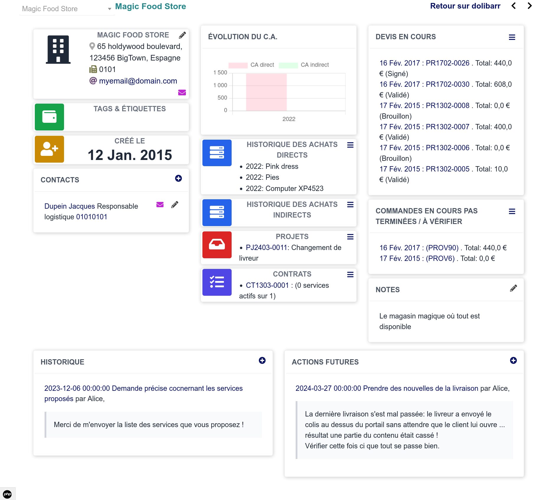 Depuis la fiche d'un tiers dans Dolibarr, cliquez sur le lien "CapCRM". Le tableau de bord s'ouvre avec toutes les informations centralisées.